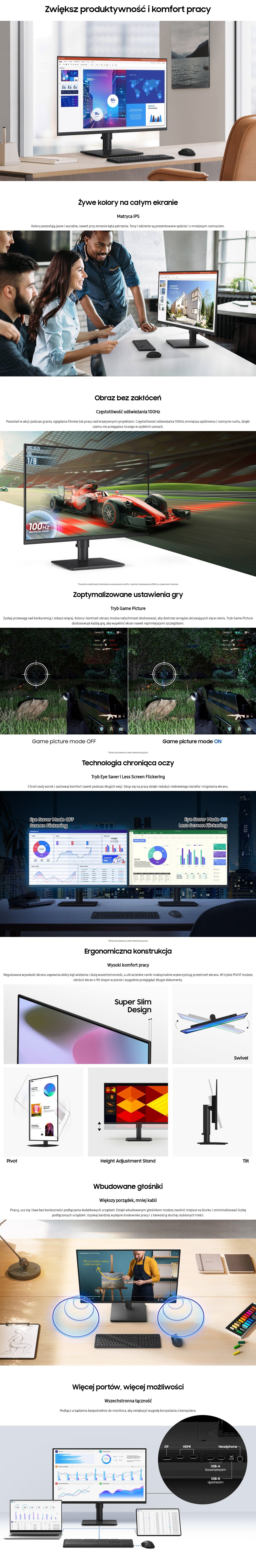Regulowana wysokość ekranu zapewnia dobry kąt widzenia i dużą wszechstronność, a ultracienkie ramki maksymalnie wykorzystują przestrzeń ekranu. W trybie PIVOT możesz obrócić ekran o 90 stopni w pionie i wygodnie przeglądać długie dokumenty.